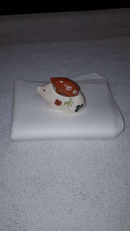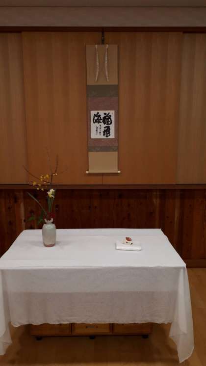 お軸は,今年の漢字を書かれる清水寺貫主 森 清範 師の『福聚海』・・・福を集めたおめでたい海というような意味でしょうか。お花は萩焼の花入れに,校長先生に頂いた蝋梅と南天,二条中の水仙を入れました。お香合は亥の親子を荘りました。
