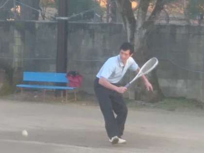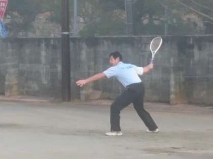 テニスコートへ行った際には、子どもたちが集まってきていきなり「ハッピバースデイ、トゥーユー!」の大合唱。それにもたまげましたが、その後「一人1回ずつ乱打をしてください。」と頼まれました。