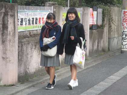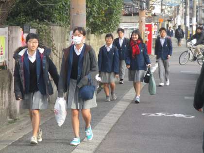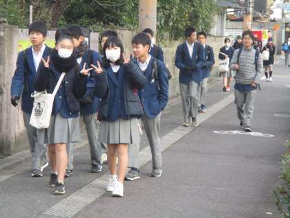 空はどんよりと曇っていますが、二条中学校の生徒は今日も元気です。