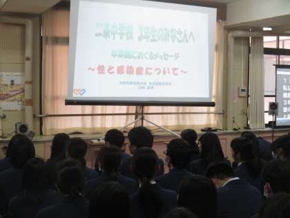 保健の時間に学習してきた内容ですが、外部から講師の方をお招きして講義を聴かせることで、改めて認識を深めさせたいという狙いがあります。