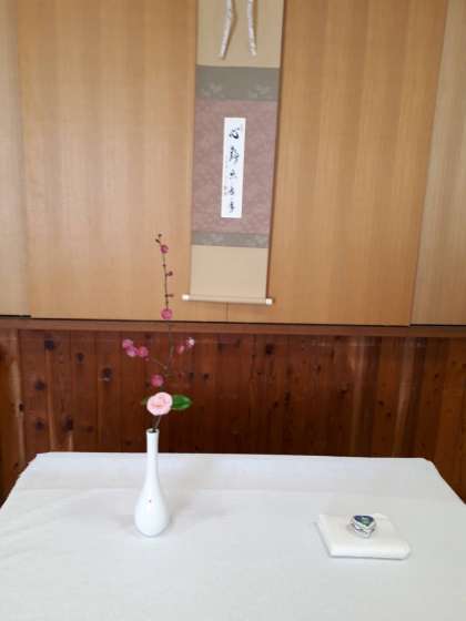 短冊は『心静楽長年』(こころしずかにながねんたのしむ)山科瑞光院 前田宗源師のお筆で,花は白磁の花入れに,本校の梅と師匠からいただいた『おとめ椿』(よく開いてしまいましたが)と本校の紅梅を入れました。大学の時にお世話になった教授からバレンタインに頂いたハート型一角獣の小物入れを香合に見立てました。