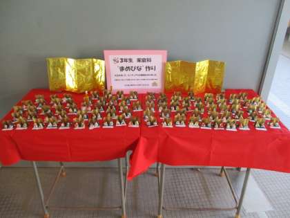 南校舎の入り口に、3年生が家庭科の時間に制作した「まめ雛」が飾られています。