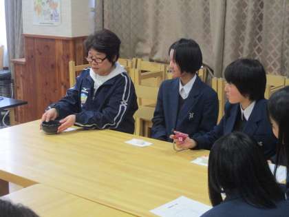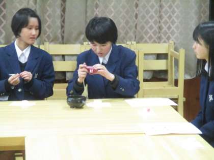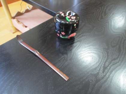 今回の茶会では、以前に自分たちで制作したお茶碗やふくさ、茶杓やお茶の葉を入れる棗(なつめ)を使って行っています。