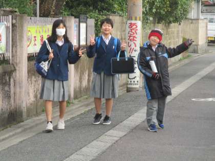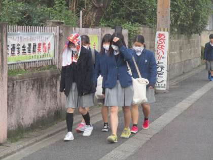 傘をもっていない生徒が多く、一番登校する生徒が多い時間帯でもあったので声を挙げました。「濡れるので急ぎなさーい!」