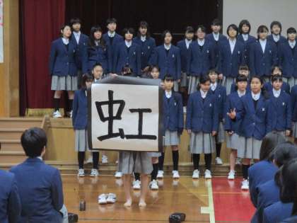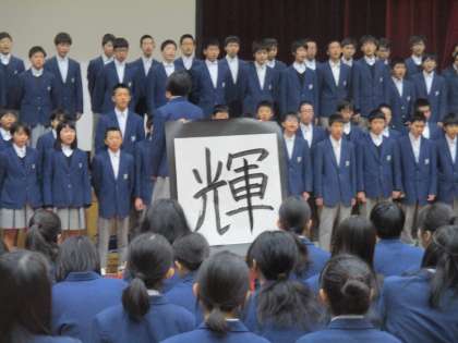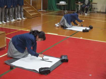 練習を見ているとき、「前の3人は何かを掲げるのだろうな」と思っていましたが、まさか、この場面で書写をするとは驚きました。