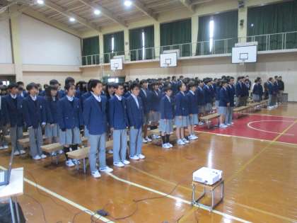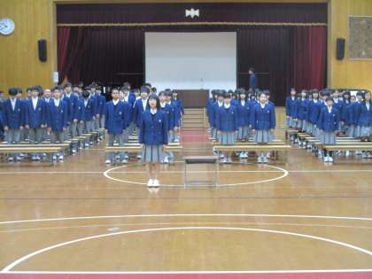 式歌が終わると、全員が起立して「蛍の光」を合唱します。