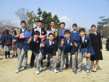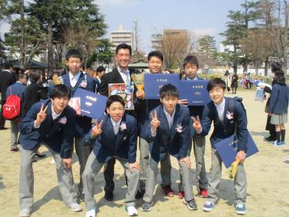 男子バスケットボール部と撮ったときには、顧問の先生がはいっていないことに気づき、慌てて撮り直しました。