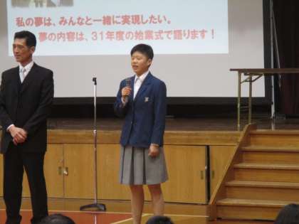 「私には夢があります。英語でいうと“I have a dream .”と言います。この夢は、ここにいる生徒に新入生を加えたメンバーで実現したいと思っています。夢の内容については来年度の始業式で話します。楽しみにしてください。」