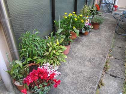 中庭に、新しい用務員さんがもってこられた鉢植えが並べられています。
