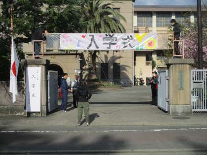 校門に国旗と市旗とを挙げ、美術部が制作してくれたアーチを掛けます。