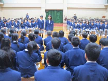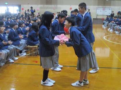 その後は、1年各クラスへのプレゼントです。学級ボールとマジック・スティックのりのセットです。大事に使ってください。