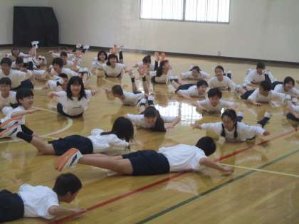 背筋力を鍛える運動です。最後の人が出来るまでみんなが待てました。
