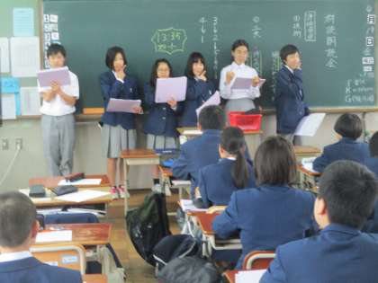 1—2の国語では朗読の発表会をしていました。授業参観ではこういう授業が良いと思います。生徒はやりがいがあって、保護者の方も観甲斐があります。