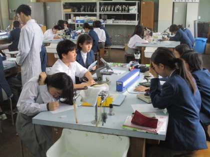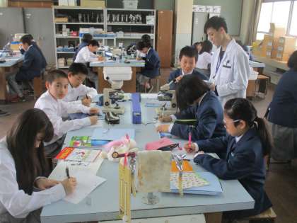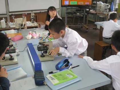 2組は理科室で実験です。顕微鏡を使っての観察のようですね。