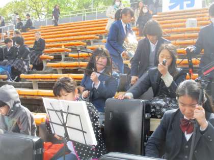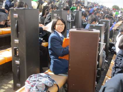 本校からも吹奏楽部の人たちが参加してくれています。600人を超える大学弾です。パートごとに分かれているので、うちの生徒を見つけるのがたいへんです。