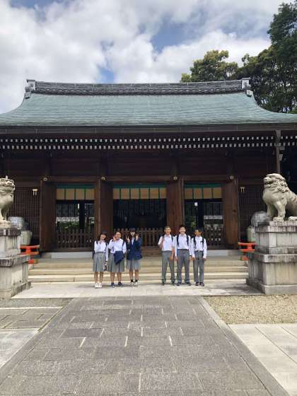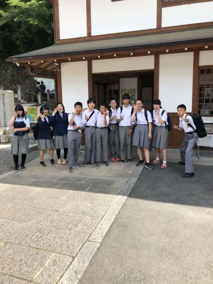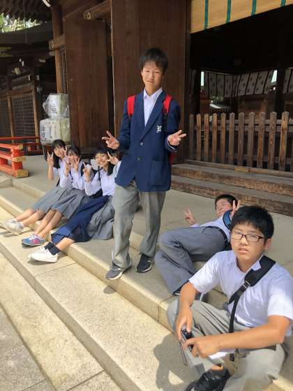 班ごとで立てた計画の行程を,班でまとまって行動し,午前中ではチェックポイントを目指して歩きます。チェックポイントでは,待機している先生に写真撮影してもらいます。チェックポイントは円山公園・建仁寺・八坂塔・京都霊山護国神社です。写真は護国神社前。みんな時間通りにチェックポイントにたどりつきましたね。Goodです。班で歩きながら,京都の魅力を感じているようでした。