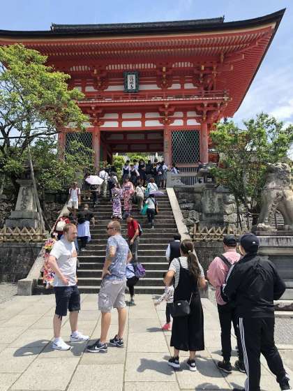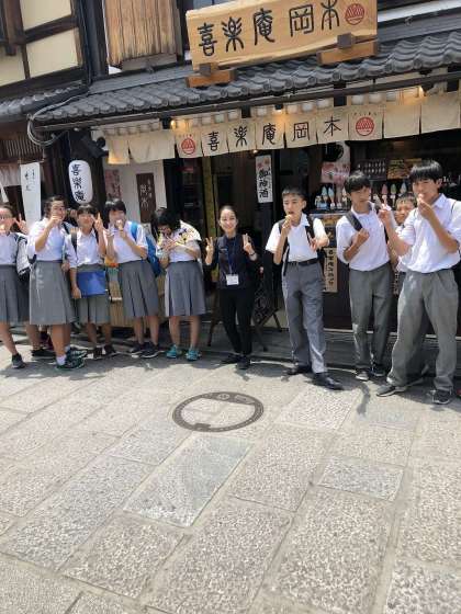 お昼ごはんも食べ終え,ウォークラリー再開です。もう一つのチェックポイントである清水寺に向かいました。二年坂,三年坂を通過し,清水寺仁王門を目指します。道中にお小遣いでアイスクリームを買って食べている人もいました。少し暑いくらいの天候でしたので,おいしそうに食べていました。観光客,修学旅行生で,清水寺周辺は人であふれかえっていましたが,みんな笑顔で元気いっぱいに歩いてました。