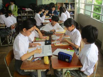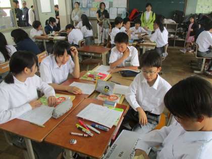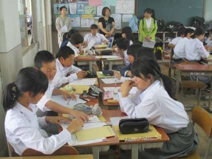 1−1は家庭科です。ここでもグループごとに話合い活動を行っています。