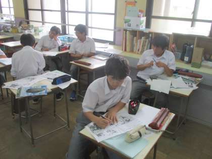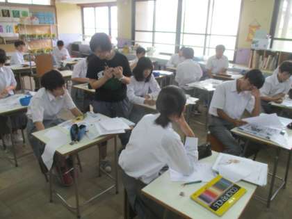 3組は美術です。扇子づくりが進行中です。