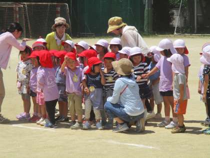 待賢幼稚園の園児が健康委員の間を通って走りました。上村先生と岡田先生も一緒に走りました。