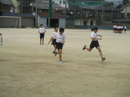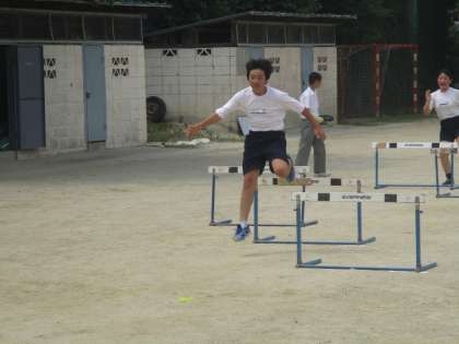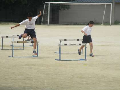 5時間目の授業の様子です。1年は体育、陸上競技です。このグループは50メートルハードルです。