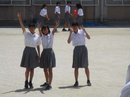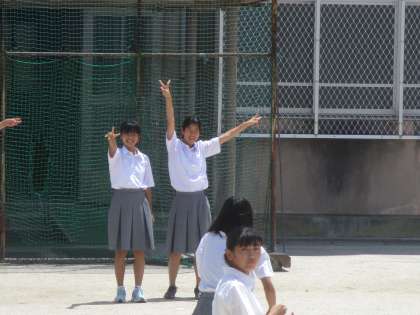 1年の女子たちは、遠くに居てもポーズをとってカメラが気付くのを待っています。