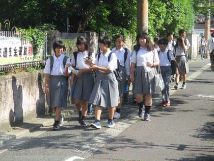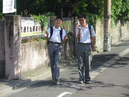 バレー部の子たちが、熱心に勉強しながらの登校です。