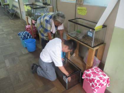 用務員さんが飼育されているウーパールーパー、アカハラ、亀、カブトムシ。これらにとても興味を持っている生徒が居ます。