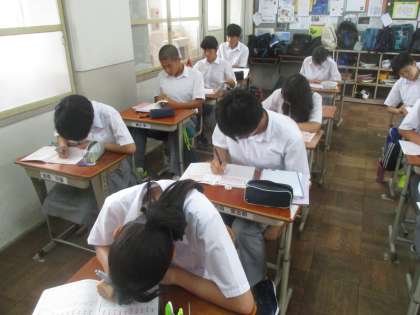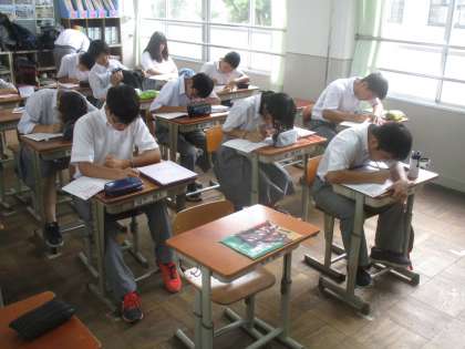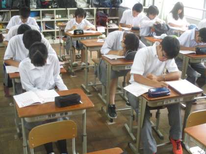 写真は、授業開始のチャイムと同時に漢字の書き取りに向き合っているところです。こういう学習方法は、生徒の自主性とやる気に火を点けて力が付くのです。