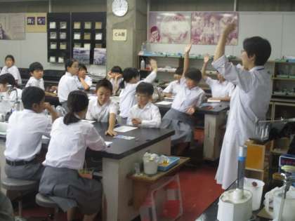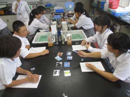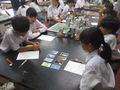 今日は午後から1年が青少年科学センターへ行き、実験室で学習をしました。