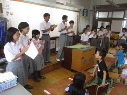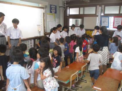 小学生と中学生とが握手やハイタッチを交わして親交を深めました。