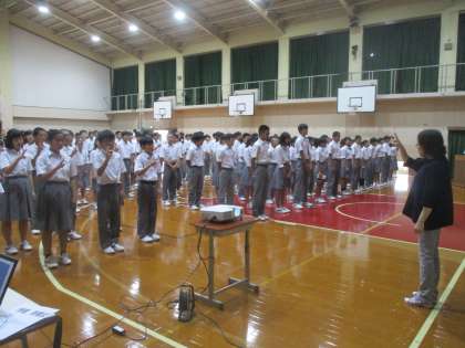 はじめに校歌斉唱です。5組のみんなは手話で歌います。