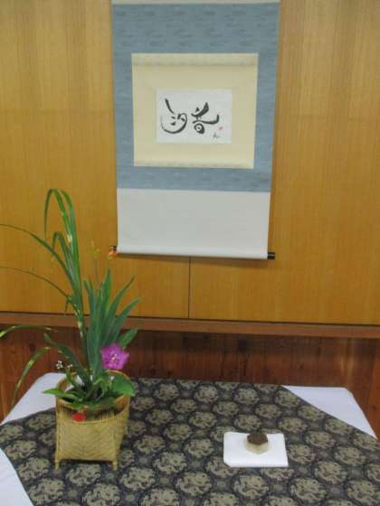 お軸は書家の策で、汐音、淡々斎好みの清風籠花入れ(竹秀斎昨)に5種類の花を入れました。お菓子は校区の亀廣脇さんの水牡丹、お茶は深草の松鶴園の宇治の昔です。