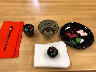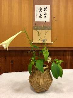 本日、8月の茶道体験学習を行いました。お軸は山科瑞光院 前田宗源師の『且座喫茶』(しゃざきっさ)、桂籠花入に吾亦紅(ワレモコウ)、不如帰(ホトトギス)、鉄砲ゆり、洋種山牛蒡、青色藤袴の5種を入れ、琉球堆錦(りゅうきゅうついきん)ハイビスカスのお香合を荘りました。お菓子は亀廣脇さんのこなしで撫子と琥珀の蓮の葉を美味しく頂きました。本日は参加者は少なかったですがしっかり練習することができました。