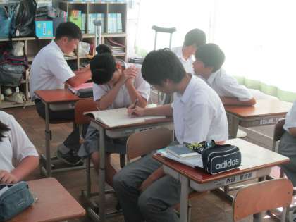 前の時間の復習でしょうか。お互いに教え経っています。これが案外力が付くのです。