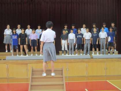 入退場の仕方から練習しました。写真は3組が歌っている場面です。