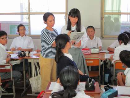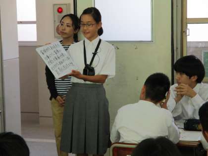 ※発表する生徒が首からさげているのは、難聴の生徒の補聴器にとばすワアレスマイクです。次々と発表者が変わるので先生が横でマイクをを持つ場合もあります。