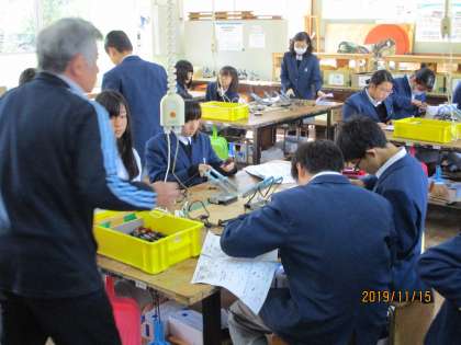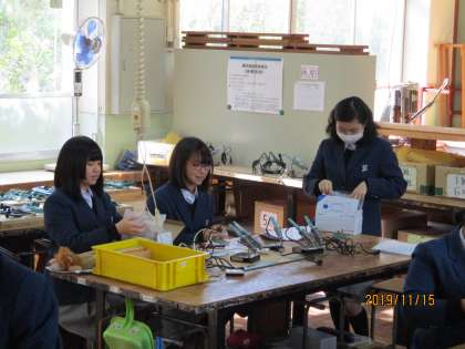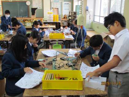 1組は授業の様子です。技術の電気の分野で非常尾用ライトを制作するようです。