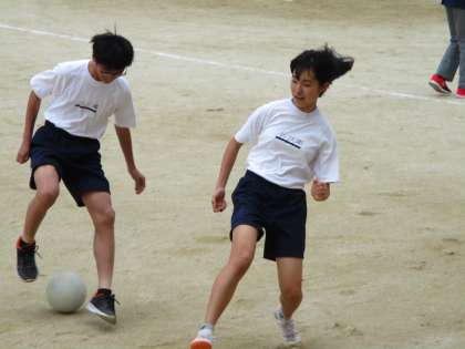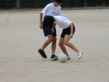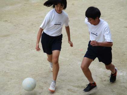 男の子と女の子が1対1でボールの奪い合いをしていました。