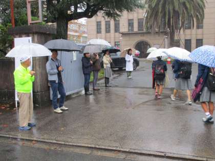PTAの皆様、地域の皆様が一緒に校門に立ってくださっていました。