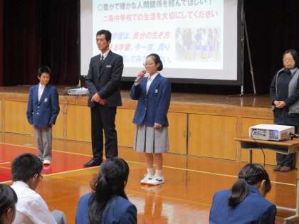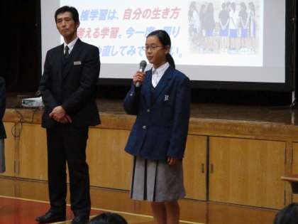 学校長の話の後、いつもの通り感想を言える人を募りました。