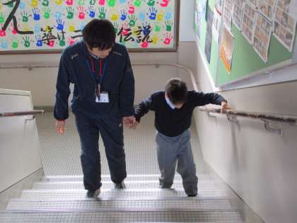 車いすで移動することの多い彼ですが、こうして歩く練習を繰り返しています。手すりがあるとかなり歩けるようになってきました。