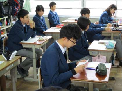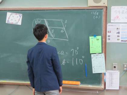 2組は数学。今日も角度を求める問題です。色々な定理や法則を使って、分かるところからどんどん求めましょう。