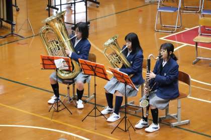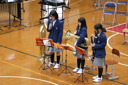 先ずは、1年フレキシブ5重奏「スザート舞曲」です。ただ、学級閉鎖の関係で3人での演奏になりました。