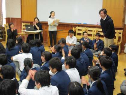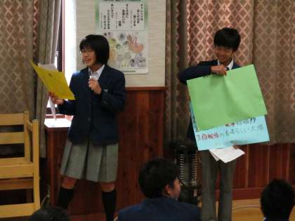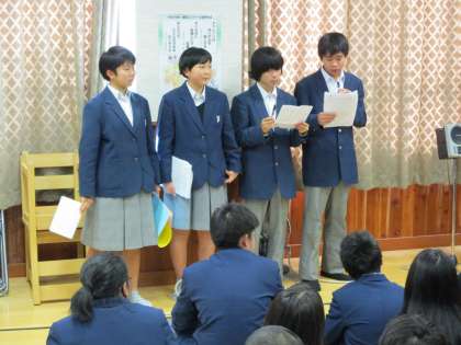 4時間目、2年が2学期を振り返る学年集会をしたので観に行きました。