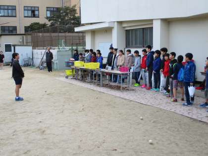 授業を受けた4つのグループで校内を移動して部活動を見て歩きました。写真はテニス部と野球部を見学しているところです。