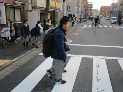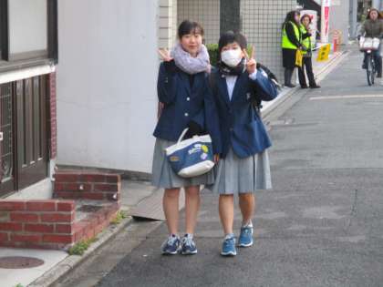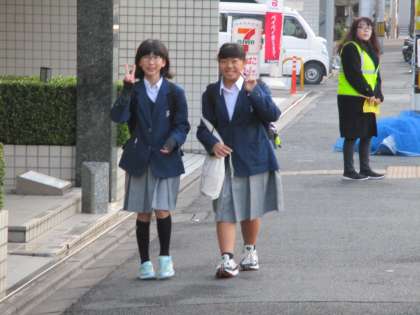 今日は15日、学校安全の日です。8時前から美福通り丸太町の交差点に立ちました。ビルの陰になって陽射しがないため、とても寒かったです。
