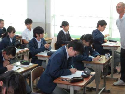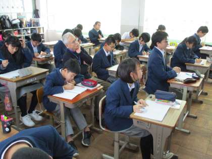 2年1組は数学の時間です。5組の生徒が交流中なので、本来この時間を担当している先生が支援に入ってくれています。