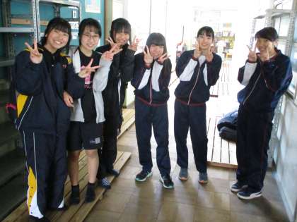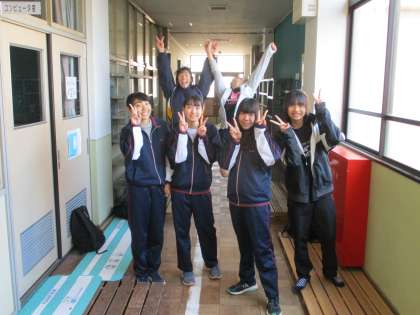 女子バスケットボール部の生徒たちが,講堂の外でアリーナが空くのを待っていました。思いっきり活動しいや!