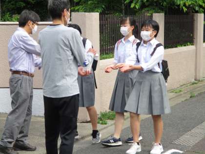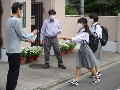 登校してくる生徒には,校門を入るところで全員に消毒をしてもらっています。